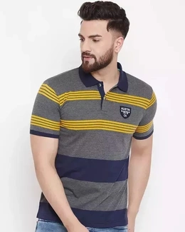 Name : Austin Wood Men's Grey Striped Polo Neck T-shirt-Plus Size Also Available