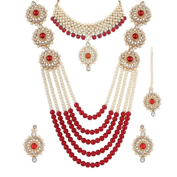 Beautiful Red Long moti necklace with choker, earring, maang tikka