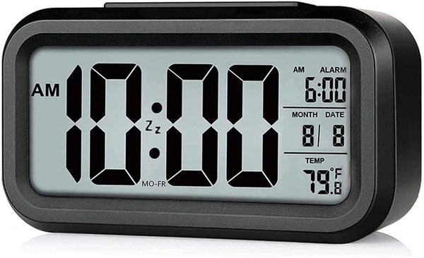Multifunctional: Alarm Clock Digital Large LCD Display, Smart backlight can keep on automatically, you can see the time clearly in the night. Includes month date alarm setting and indoor temperature.
