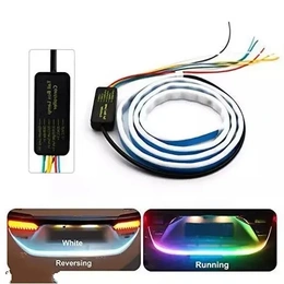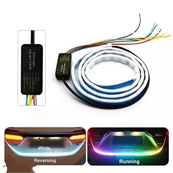Multi-functions : tailgate led strip light has a streamer design that can be used as a taillight, running and driving light, turn signal light, brake light, parking light, hazard flashers, reverse light and more modes Work style: double colour time entertaining diversions/brake light switch/turn signal/tail lamp box, road show ice blue, brake shows red, turned to the water slide