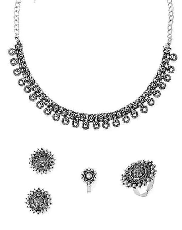 Name : Women's Latest Design Silver Oxidised Necklace Contemporary Design Ethnic Choker Necklace Set with Nose Pin and Earrings | Oxidized Necklace & Earrings | Indian Traditional Jewellery | Traditional Choker Necklace Set | Necklace & Earrings Set for Girls & Women | Charms Necklace