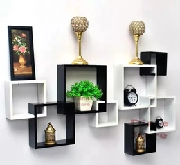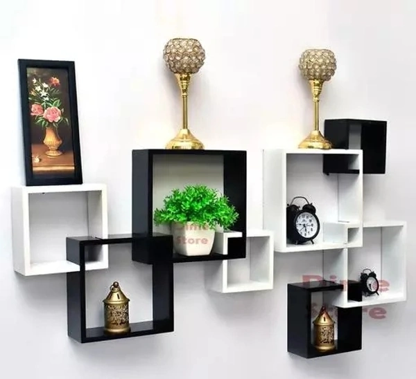 Dime Store Wooden Intersecting Wall Shelves (Set of 8) Designed and developed by our talented designers, this very outstanding set of floating shelves are based on a great deal of research work and testing to make sure they are not only decorative but also functional. 1. A simple set of wall shelves which create additional shelving space at home or office for displaying and organizing vases, family pictures, collections, keepsakes or storing items in kitchen, pantry, living room, bedroom and more. 4 inch deep, 4 different sizes for grouping in any ways. 2. Different from most shelves which can be placed only in one way but these shelves can be arranged in multiple ways, adds a nice modern and beautiful touch on any wall! 3. Easy to assemble with easy to follow instruction and all necessary hardware provided, sturdy and durable. Box Contains 8× wall shelves, 4× wall screws, 4× dry wall plugs Easy to Hang Only 4 wall drills for 8 shelves, less screw holes than others, reduce the damage to the wall. Easy to Assemble Same size groove in all shelves make it easy to assemble and show your creativity by arranging it in multiple ways. Premium Deco Finish These shelves comes with deco paint finish with give a premium smooth finish.